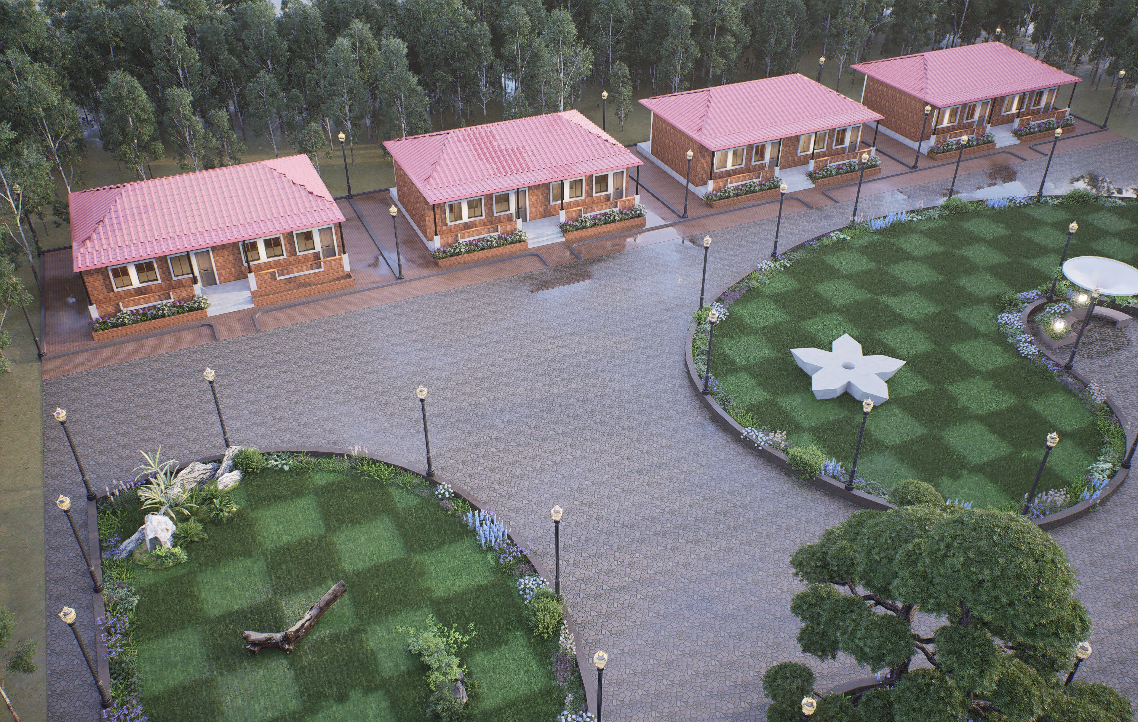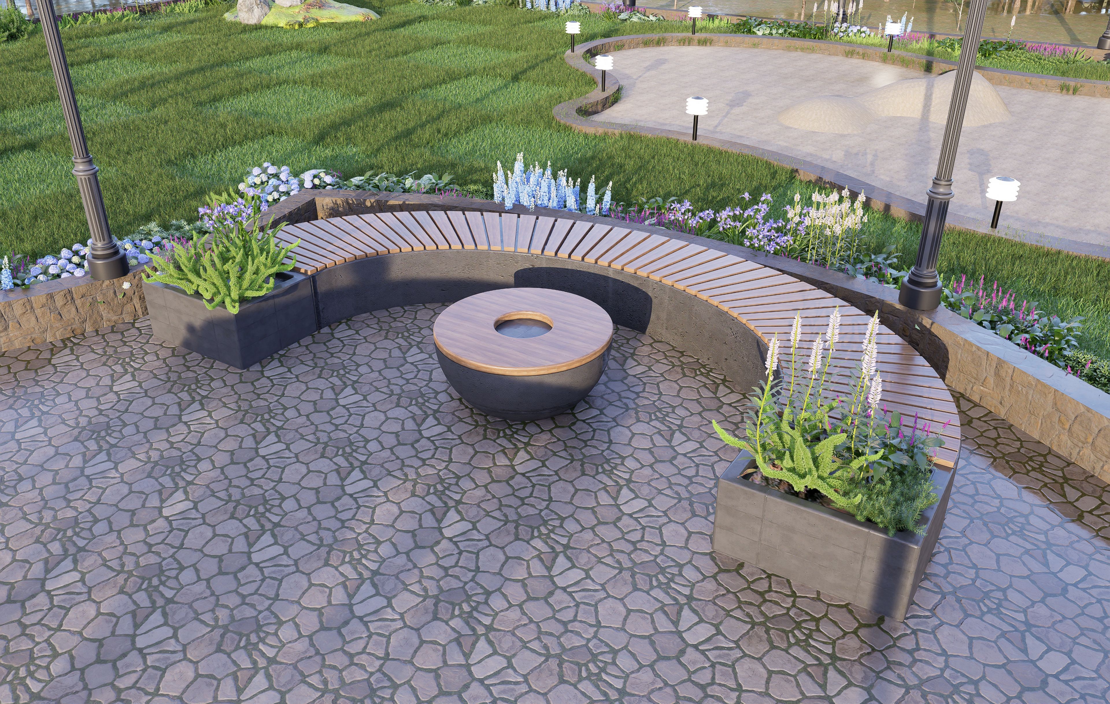 Integrated Layouts: Clear visualization of walkways, seating areas, and rest spots within the garden, confirming optimal flow and accessibility.